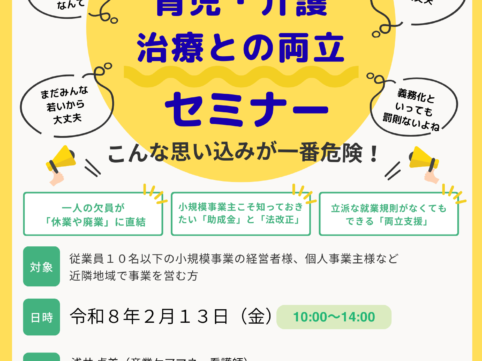 2026年2月13日(金)に愛知県・一宮市のコワーキングスペース 森と川に咲く花で『小規模事業所&個人事業主向け「育児・介護の両立支援セミナー」』を開催します。 小規模・個人事業主向けの育児・介護と仕事の両立支援...