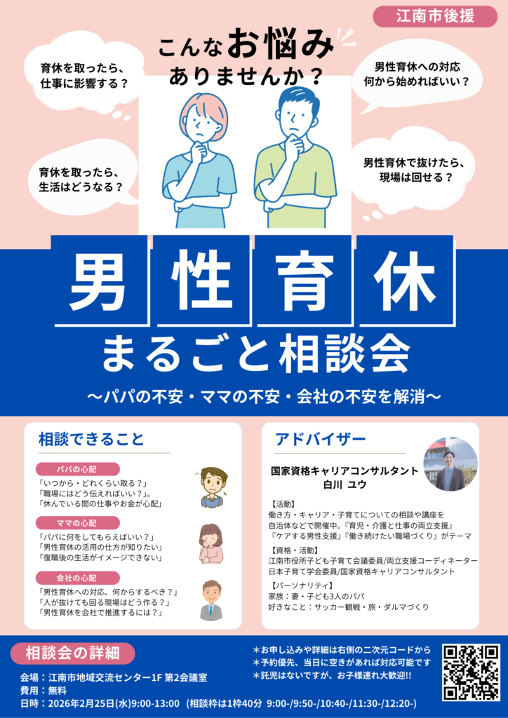 2026年2月25日(水)に愛知県・江南市で『男性育休まるごと相談会〜パパ・ママ・会社の不安を解消』(江南市役所後援)を開催します。