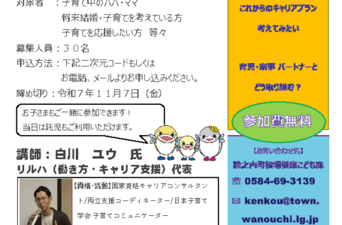 2025年11月27日(土)岐阜県・輪之内町で輪之内町健康こども課 主催『子育て・家事・仕事まるごと応援セミナーについて』を開催します。 「子育てと家事」や「子育てと仕事」の両立の不安を解消するヒントを一緒に考える内容で...