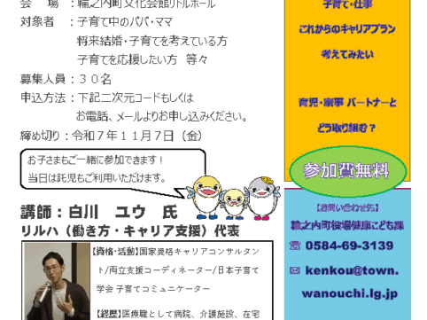 2025年11月27日(土)岐阜県・輪之内町で輪之内町健康こども課 主催『子育て・家事・仕事まるごと応援セミナーについて』を開催します。 「子育てと家事」や「子育てと仕事」の両立の不安を解消するヒントを一緒に考える内容で...